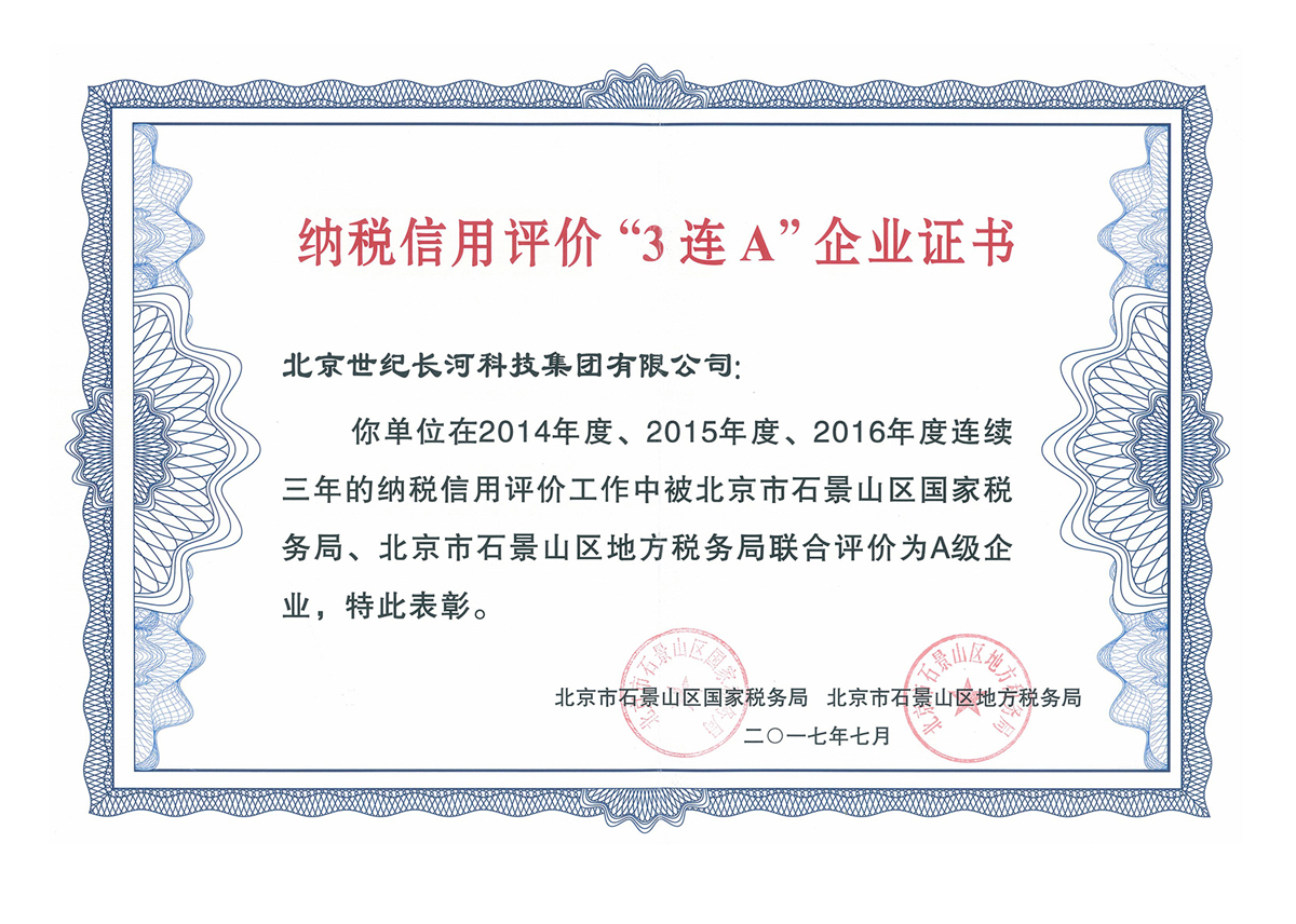 世紀長河集團獲評納稅信用“3連A”企業榮譽稱號