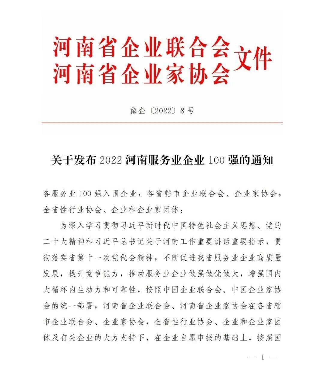“2022年河南服務業企業100強”榜單位居73名