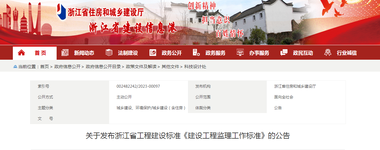關(guān)于發(fā)布浙江省工程建設(shè)標準《建設(shè)工程監(jiān)理工作標準》的公告